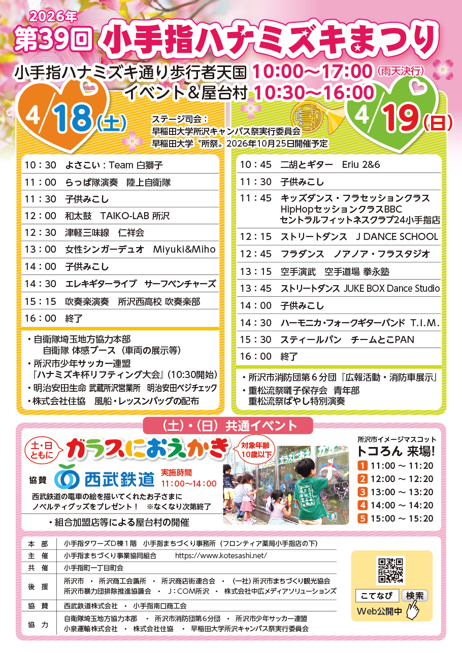 通りでは、屋台村、フリーマーケット、小手指子供神輿、福祉施設の出店、所沢市少年サッカー連盟によるハナミズキまつり杯・